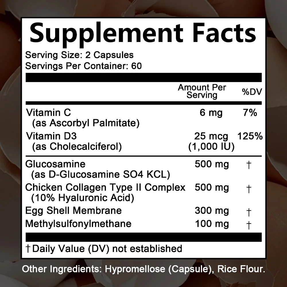 Ingredients: Type II Collagen, Glucosamine, MSM, Vitamin D3, Vitamin C